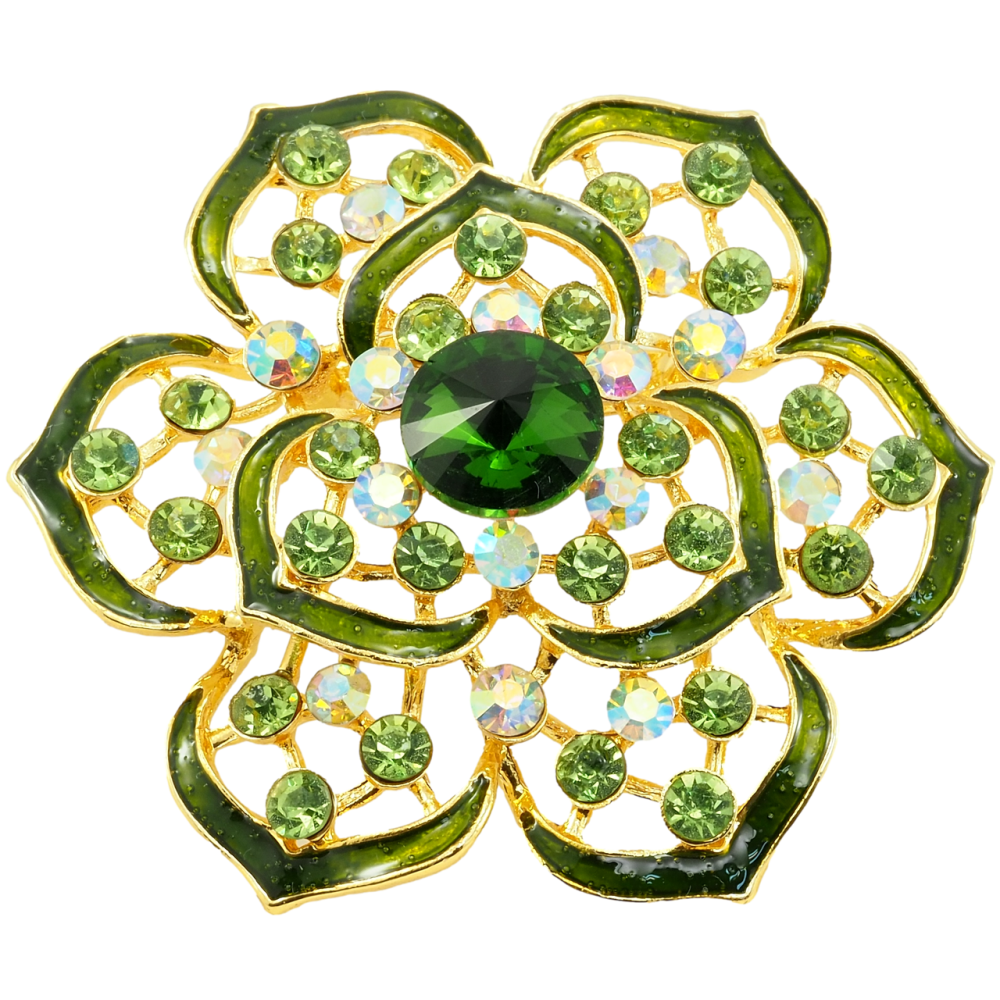 Брошка Квітка із зеленими стразами та емаллю
