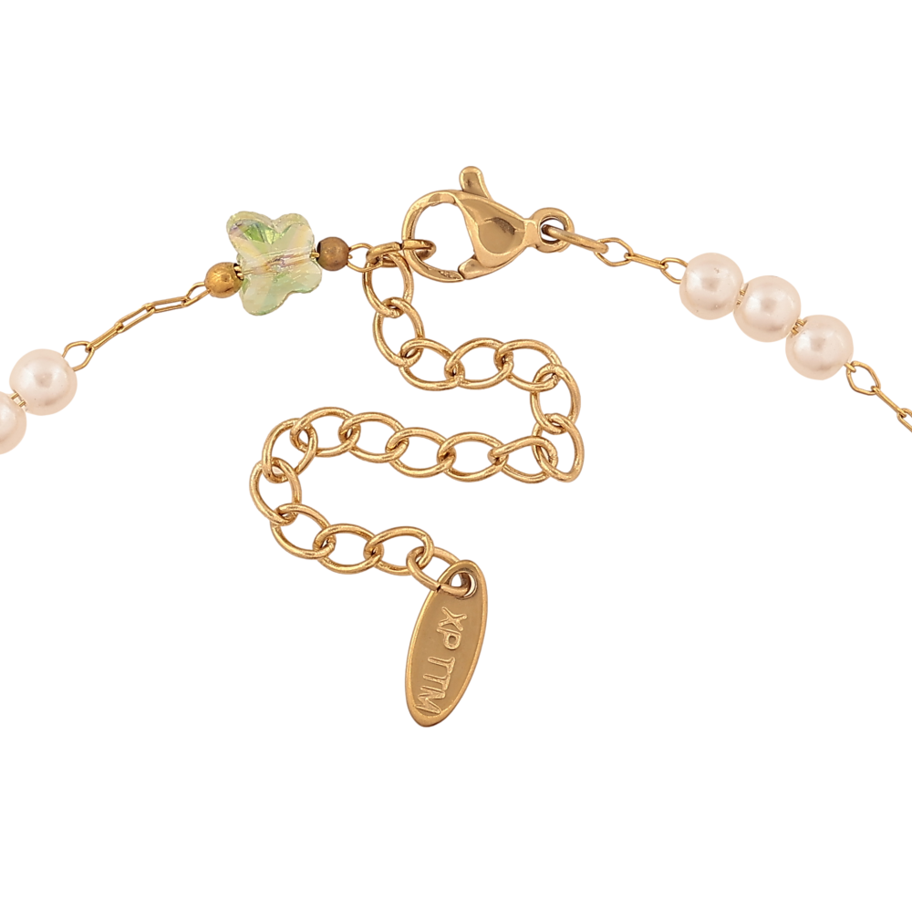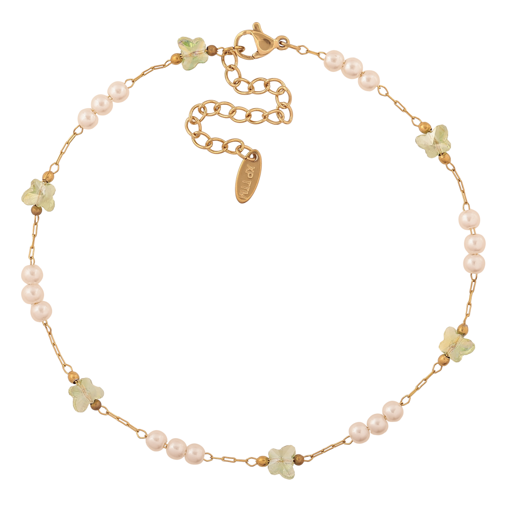 Браслет Xuping ТТМ Stainless Steel колір 14К на ногу "Ланцюжок із зеленими метеликами та перлинними бусинами" довжина з доп. ланцюжком 24.5-30см х 1-6мм