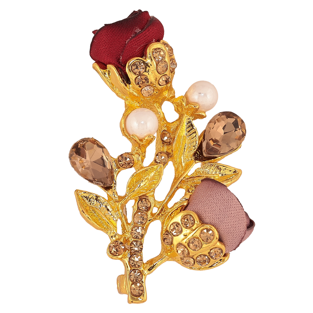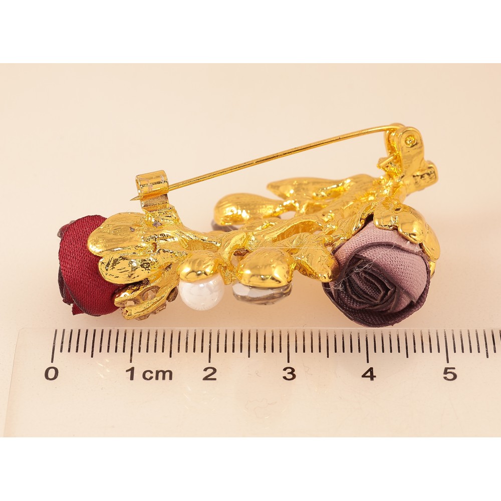 Брошка "Гілочка з бежево-червоними квіточками, стразами та перлинами"