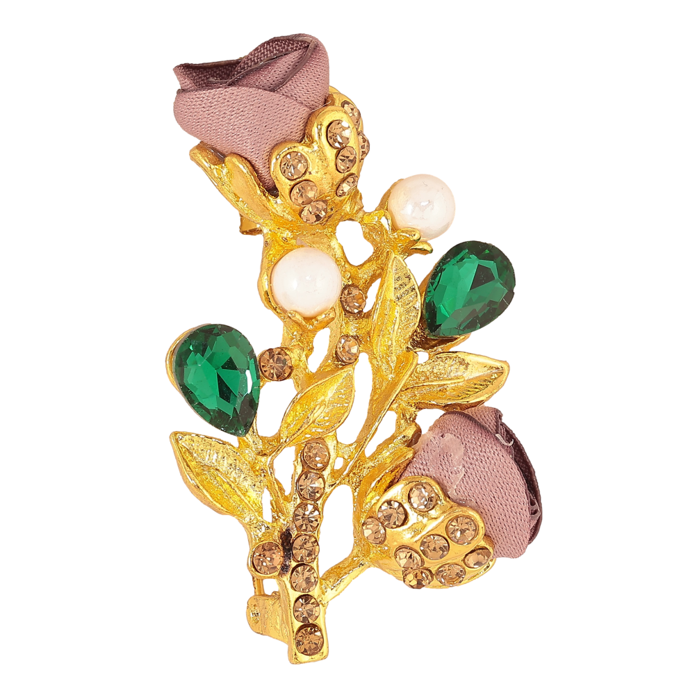 Брошка "Гілочка з бежевими квіточками, стразами та перлинами"
