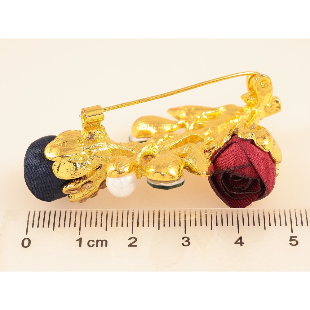 Брошка "Гілочка з червоно-синіми квіточками, стразами та перлинами"