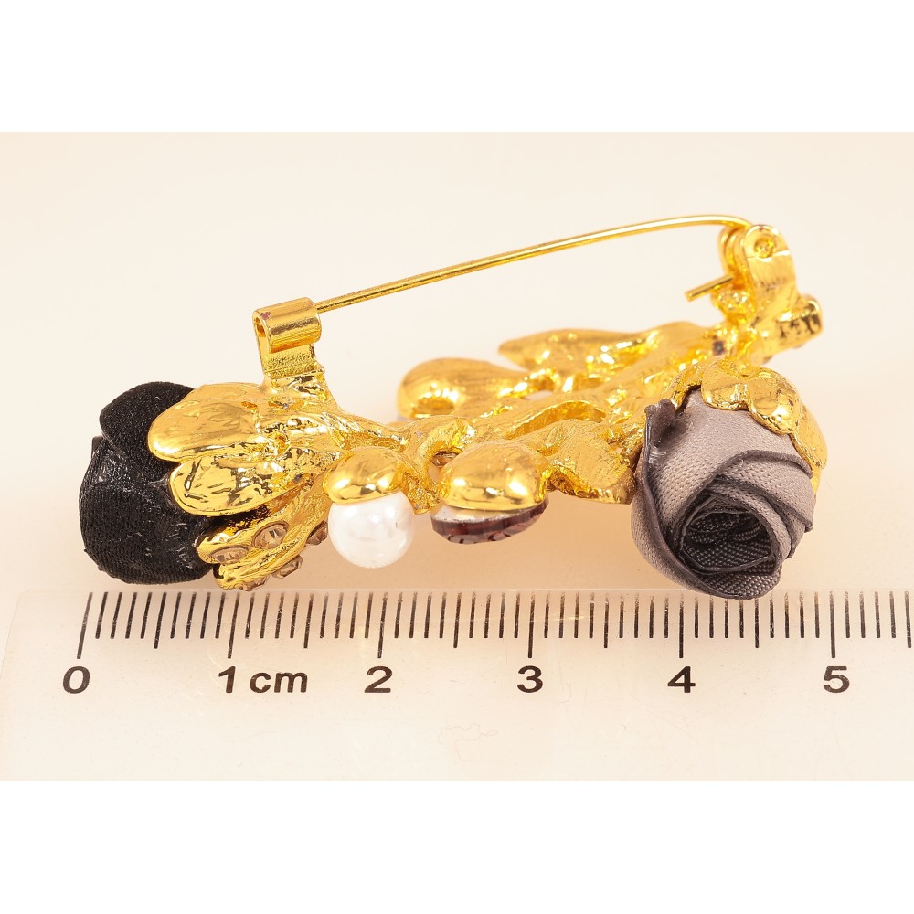 Брошка "Гілочка з чорно-сірими квіточками, стразами та перлинами"