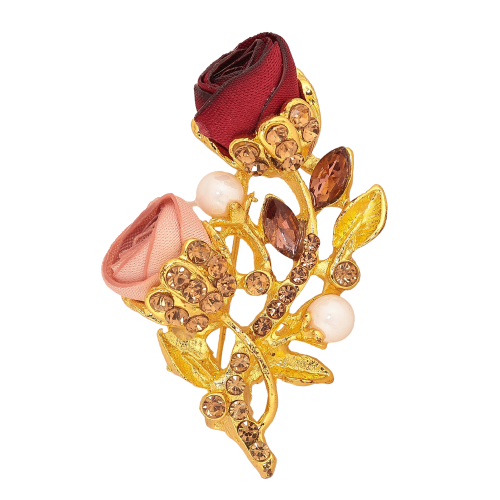Брошка "Гілочка з рожево-червоними квіточками, стразами та перлинами"
