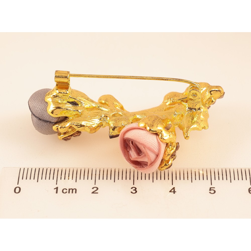 Брошка "Гілочка з рожево-сірими квіточками, стразами та перлинами"