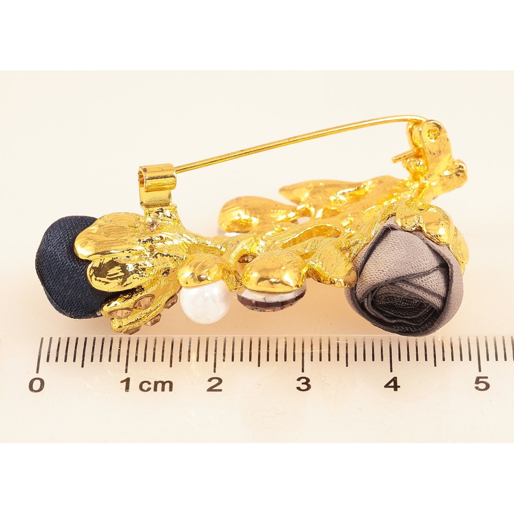 Брошка "Гілочка з синьо-бежевими квіточками, стразами та перлинами"