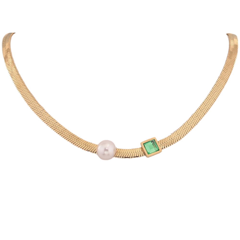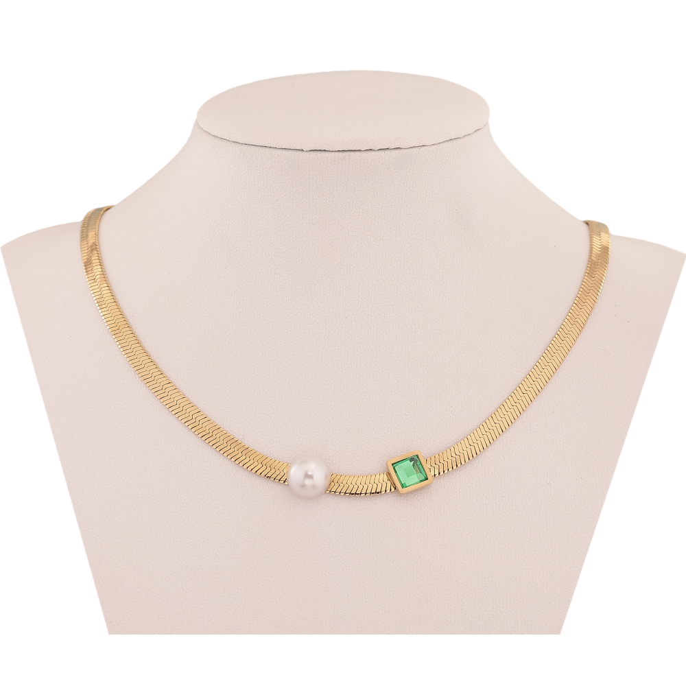 Кольє Xuping ТТМ Stainless Steel колір 14К "Ланцюжок з перлиною та зеленим кристалом" довжина 45-51см х 4мм