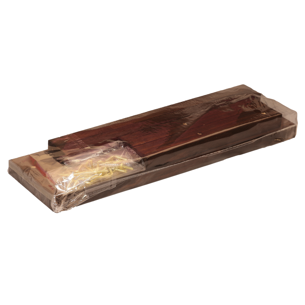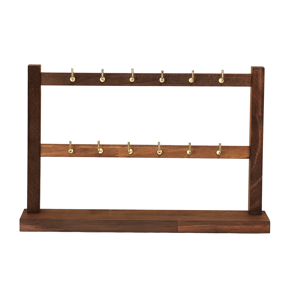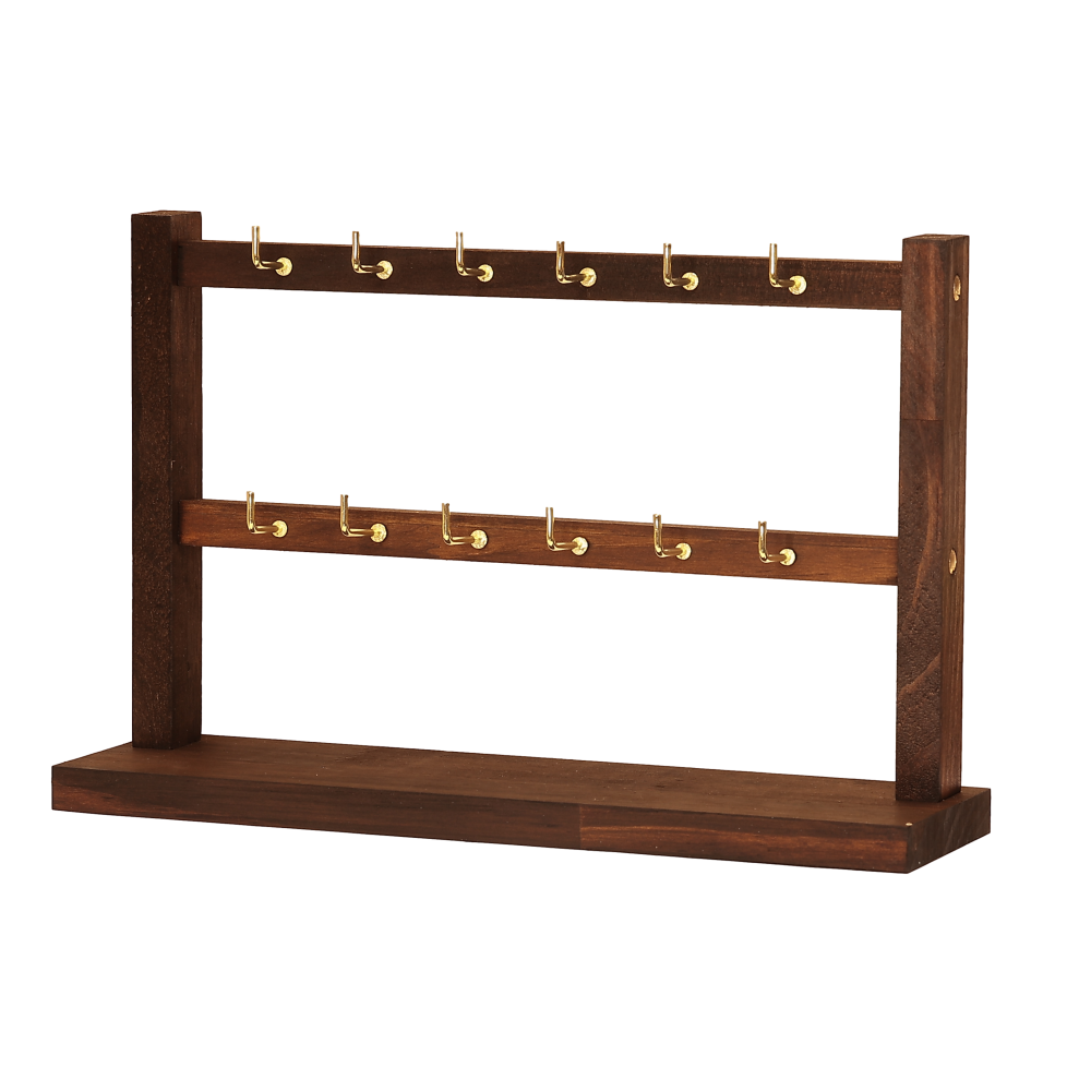 Демонстраційна підставка з дерева із золотистими металевими гачками, для продажу або домашнього зберігання біжутерії та ювелірних виробів. Відправляється стійка у розібраному вигляді. Збирається легко, без використання додаткових інструментів, так як у ній вже є всі пази та отвори, гачки вкручуються.