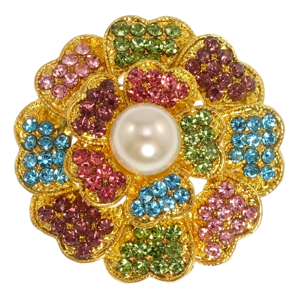 Брошь Цветочек с разноцветными стразами и жемчугом