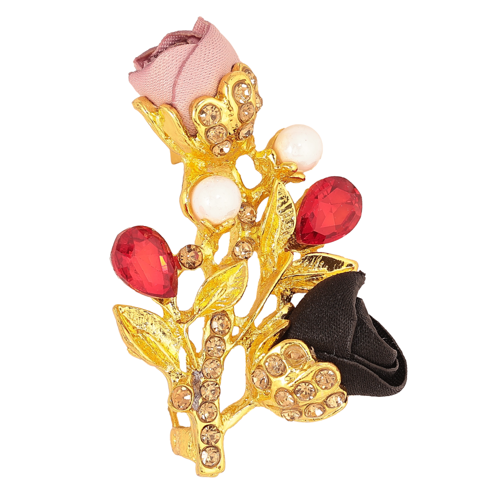 Брошь "Веточка с розово-черными цветочками, стразами и жемчужинами"
