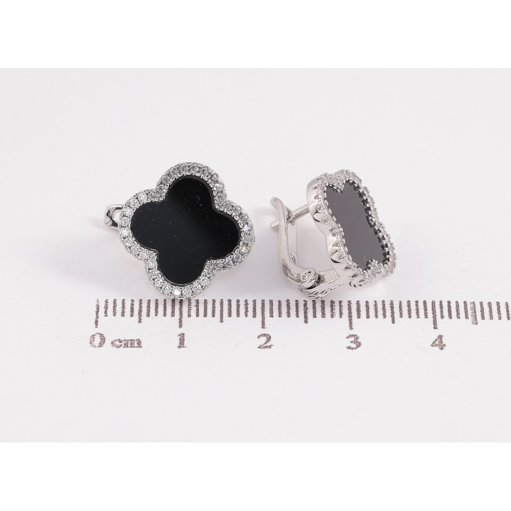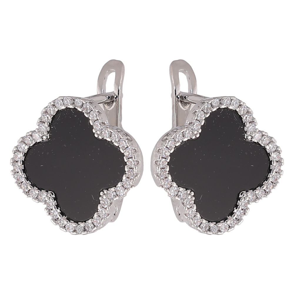Серьги Нержавеющая сталь английский замок "Клевер с черными вставками и кристаллами"