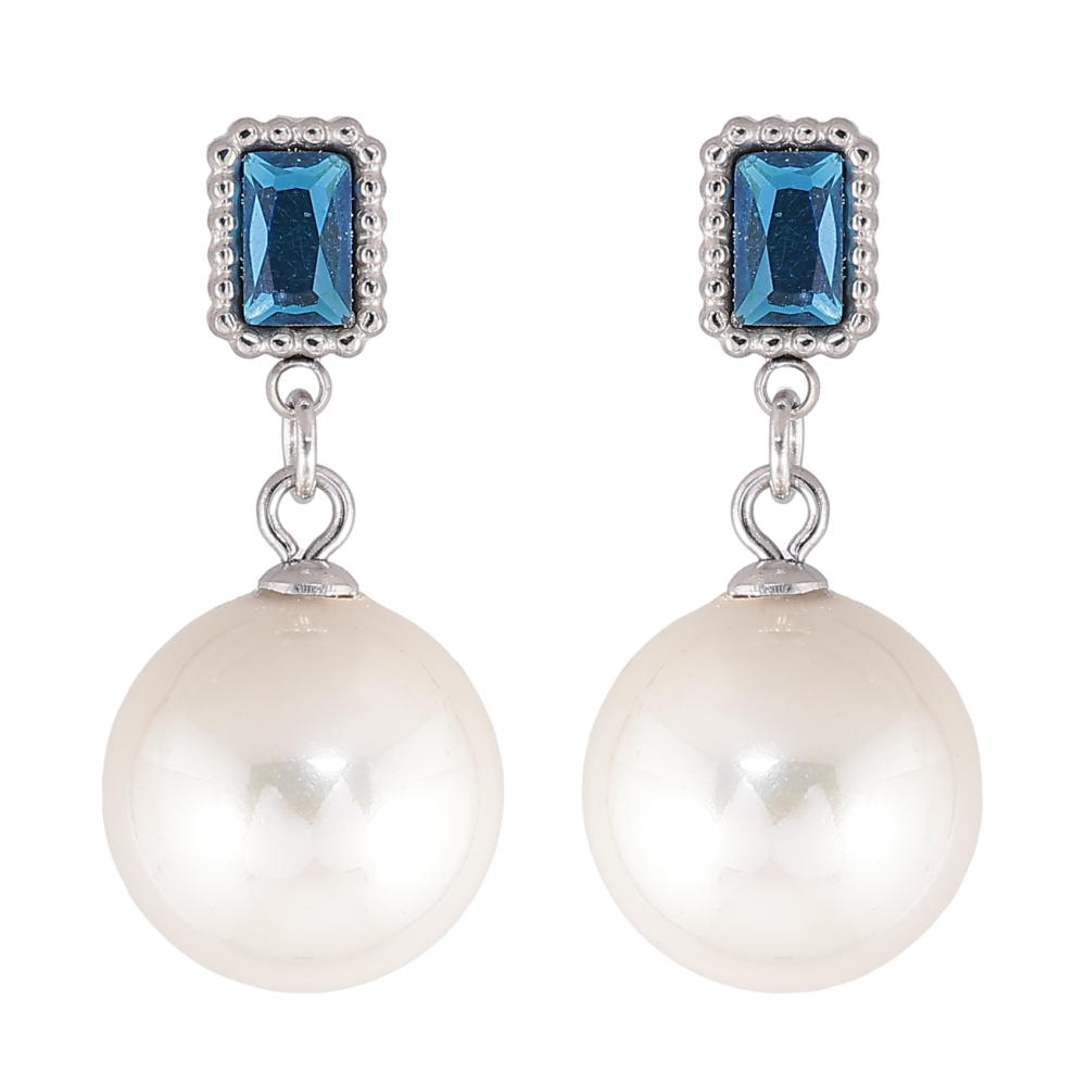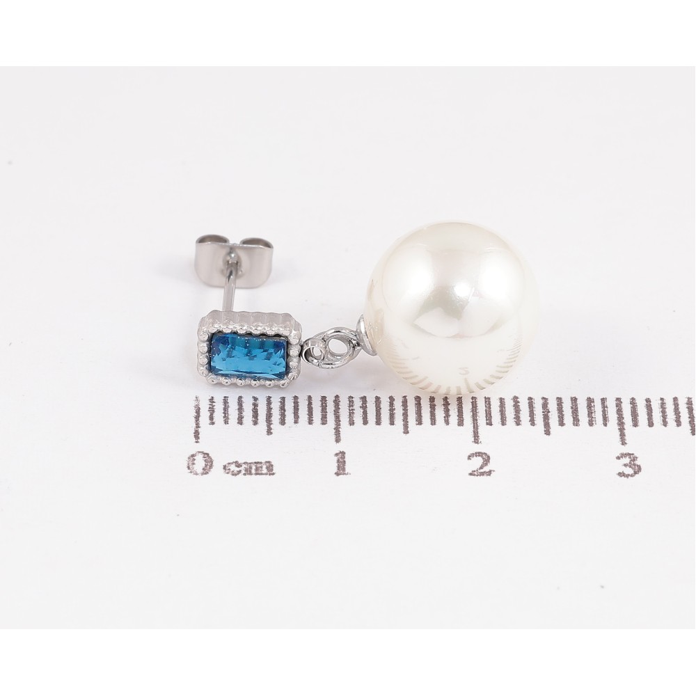 Серьги Нержавеющая сталь пусеты "Синие кристаллы с жемчужными подвесками"