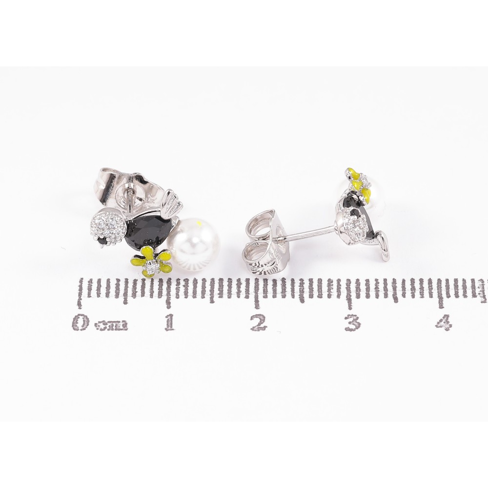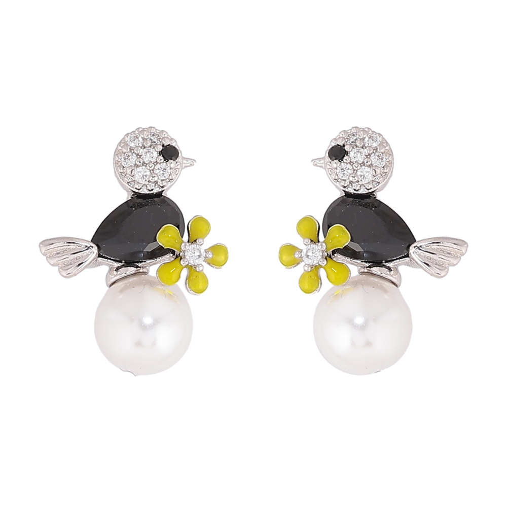 Серьги Xuping цвет Родий пусеты "Птичка с черным кристаллом на жемчужине"