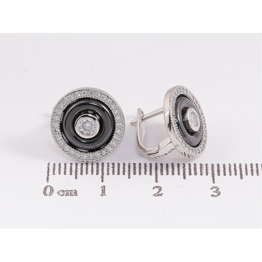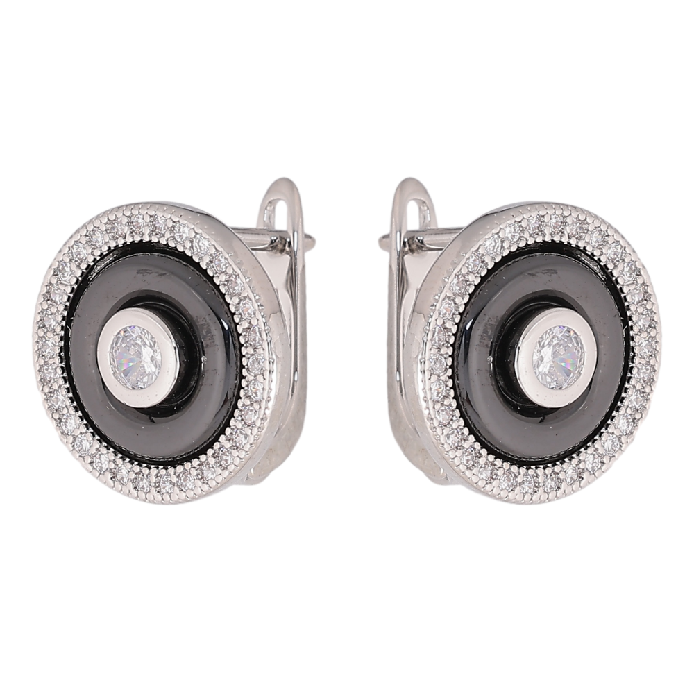 Серьги Xuping TTM Stainless Steel цвет Родий английский замок "Круги с черной керамикой и кристаллами"