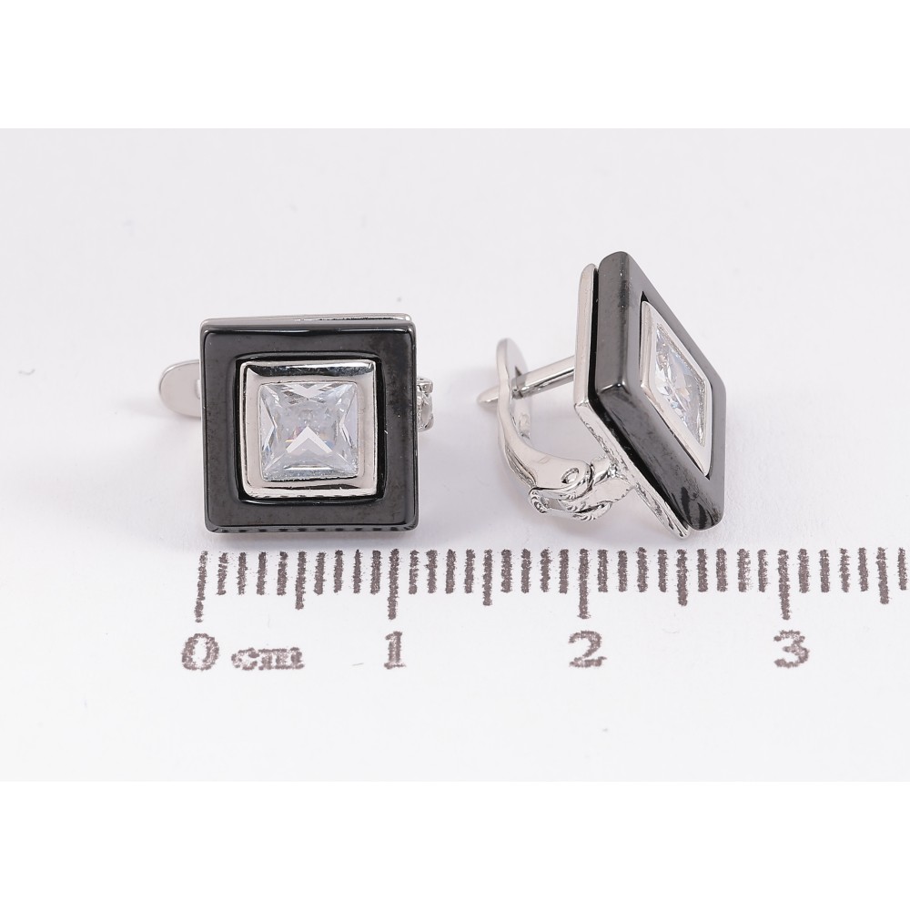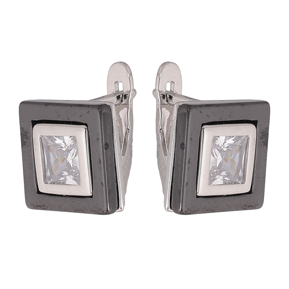 Серьги Xuping TTM Stainless Steel цвет Родий английский замок "Квадраты с черной керамикой и кристаллами"