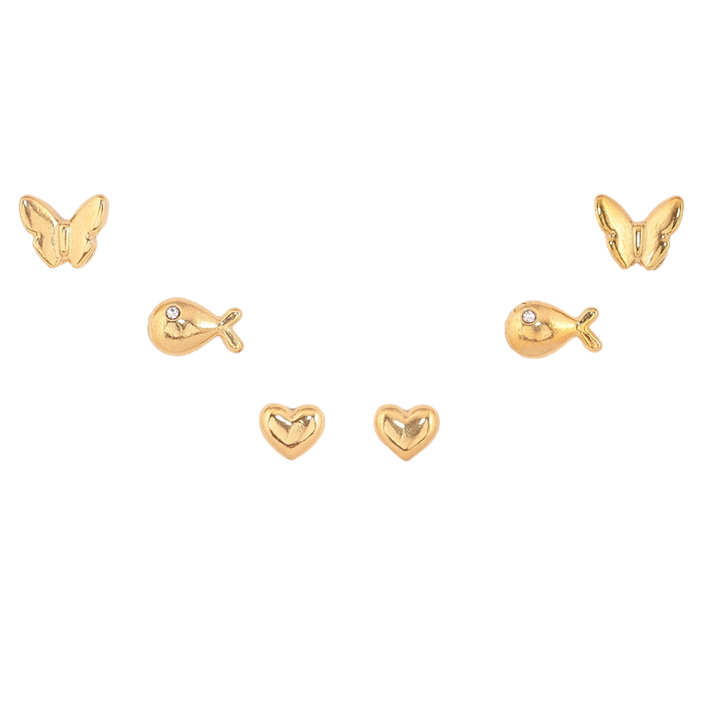 Сережки Набір (3 пари) Xuping TTM Stainless Steel колір 14К пусети "Метелики, рибки та серця"