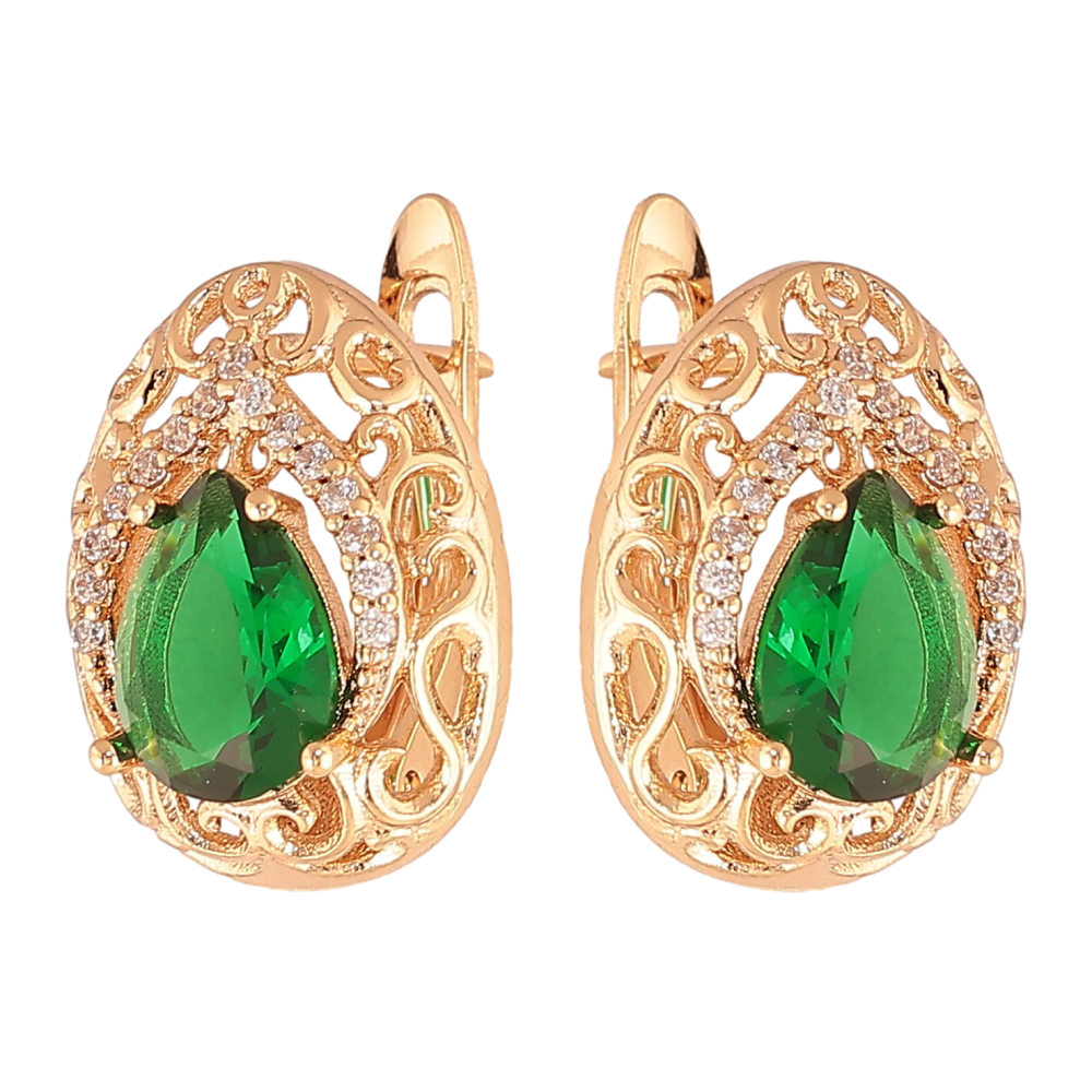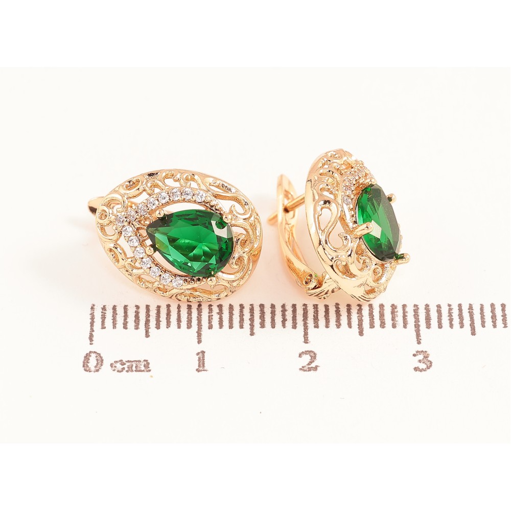 Сережки Xuping колір Позолота 18K англійський замок "Ажурні крапельки з зеленими кристалами"