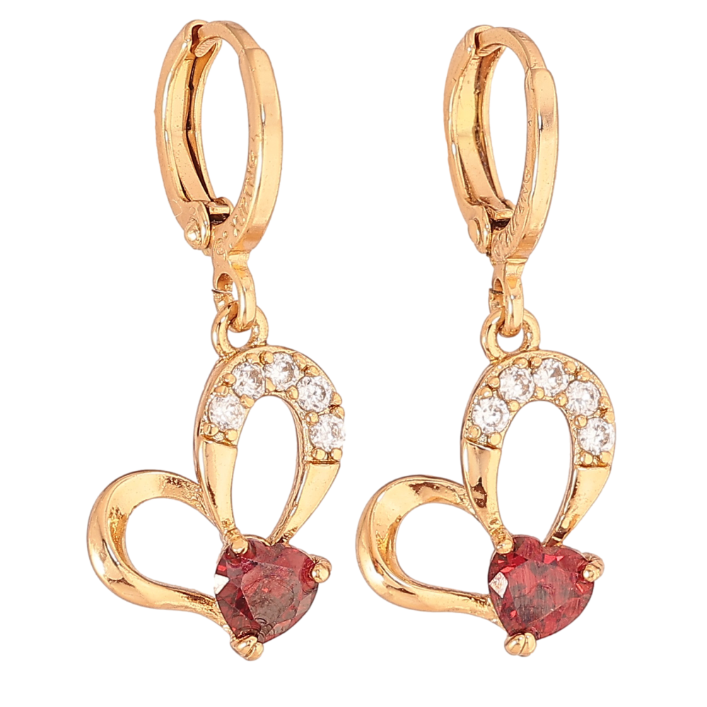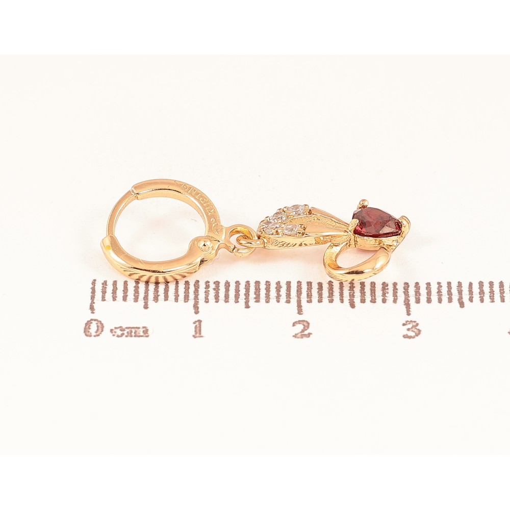 Сережки Xuping колір Позолота 18К підвіски на колечках "Сердечки з червоними кристалами" на один бік