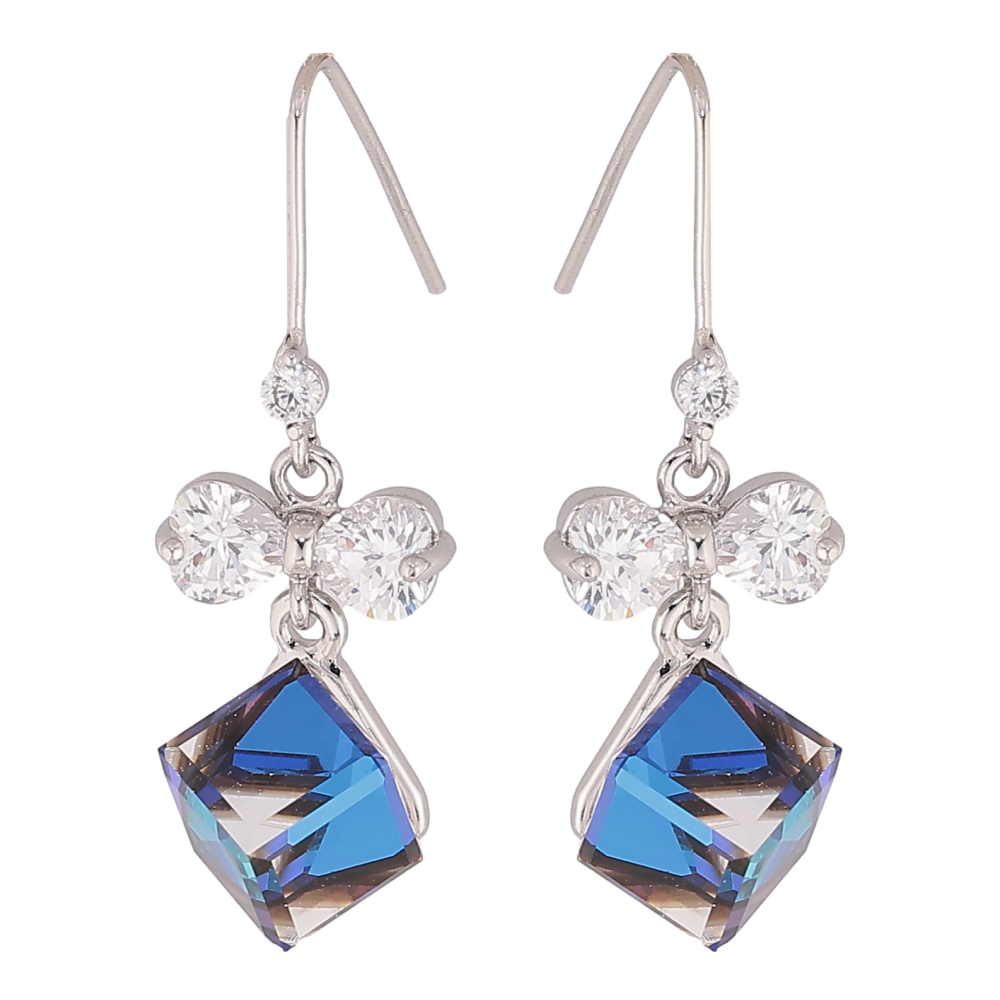 Сережки Xuping колір Родій з кристалами Swarovski французький замок "Кристальні кубики Bermuda Blue з бантами"