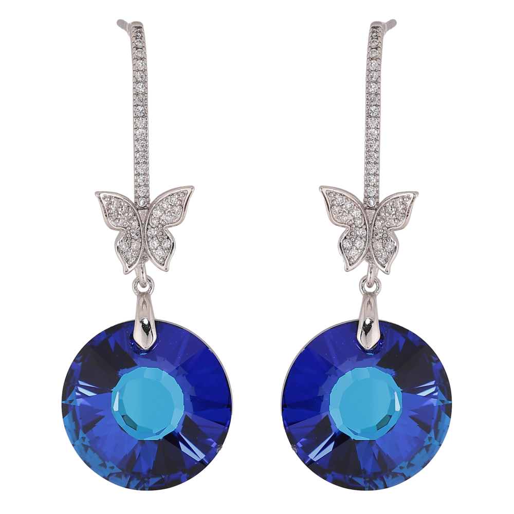 Сережки Xuping колір Родій з кристалами Swarovski пусети "Кристальні дуги з метеликами та підвісками Bermuda Blue"